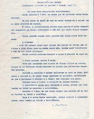 O Fernando Teixeira fez-nos chegar esta carta, datada de 1970, endereçada pelo professor da escola do Lumege ao comandante da nossa Companhia.